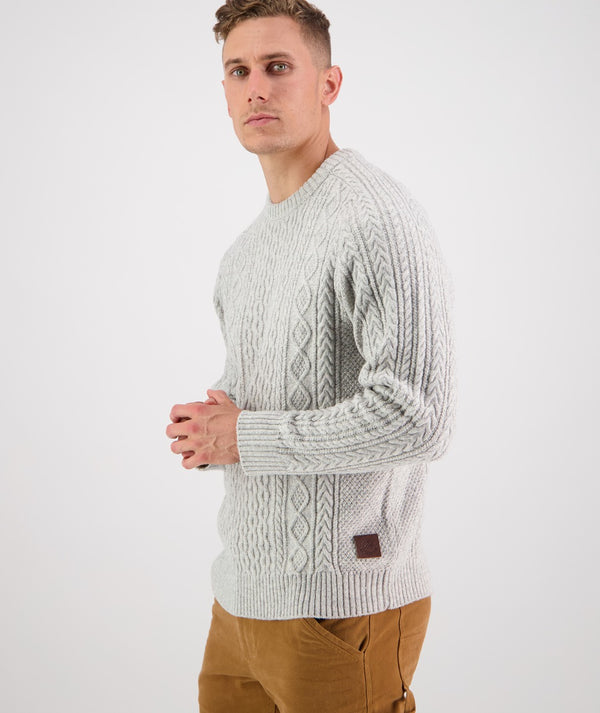 Swanndri Mens Colac Bay Cable Knit Crew 65% lambswool 35% nylon Heavy gauge cable knit Leather brand patch Raglan sleeve